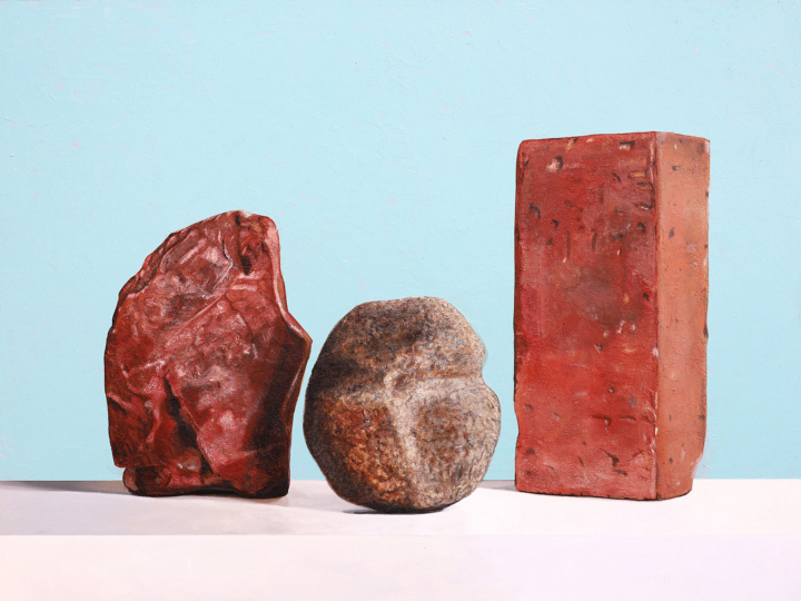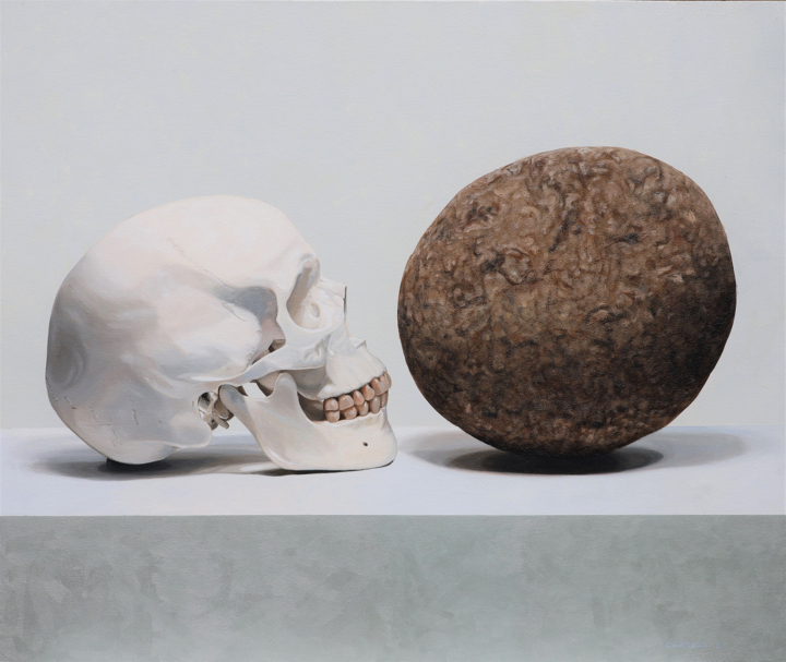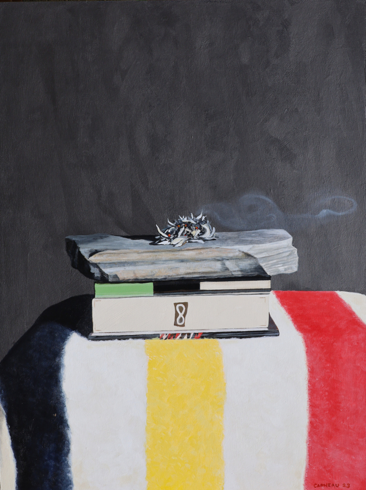 David Garneau a commencé à peindre des natures mortes à la naissance de son aîné, B, aujourd’hui âgé de vingt-neuf ans. Dans des tableaux de petite taille – en raison des conditions de vie exiguës – il voulait représenter non seulement les artefacts de sa nouvelle situation domestique, mais aussi ses pensées et ses sentiments à propos de la parentalité et de la façon dont sa vie changeait. Il a également voulu imprégner son œuvre de son intérêt pour la théorie, la psychologie, la philosophie et d’autres sujets. Un tube de peinture fait face à une tétine devant un mur de livres. Peut-on être à la fois un bon parent et un bon artiste ? Une autre tétine est posée sur un miroir (Lacan) devant les œuvres rassemblées de Freud.