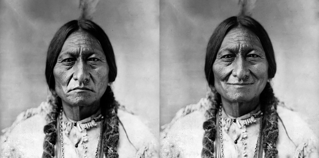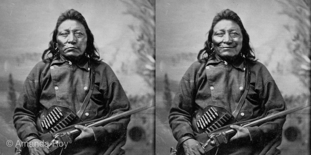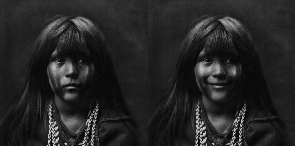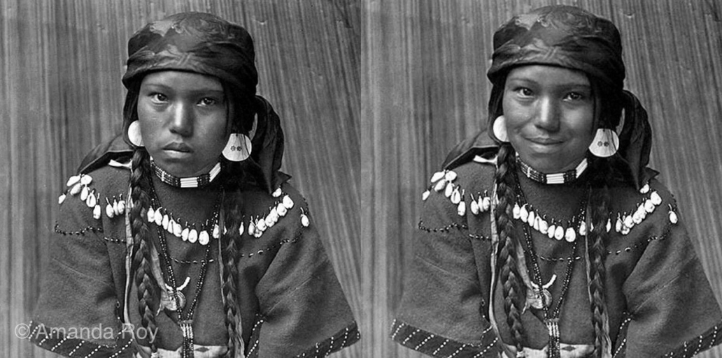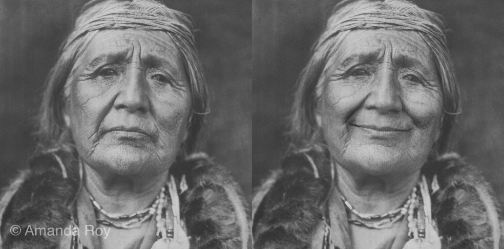 En 1906, J.P. Morgan a engagé le photographe américain Edward Curtis pour créer une série de portraits documentant le NDN* américain. Pendant plus de cinq ans, Curtis est parti avec son appareil photo, des malles d’accessoires et des regalia, et a voyagé dans les communautés, mettant en scène des modes de vie autochtones fortement idéalisés. Dans presque toutes ces photographies, Amanda Roy a remarqué que les expressions faciales des modèles n’étaient composées que de regards tristes et de froncements de sourcils.
